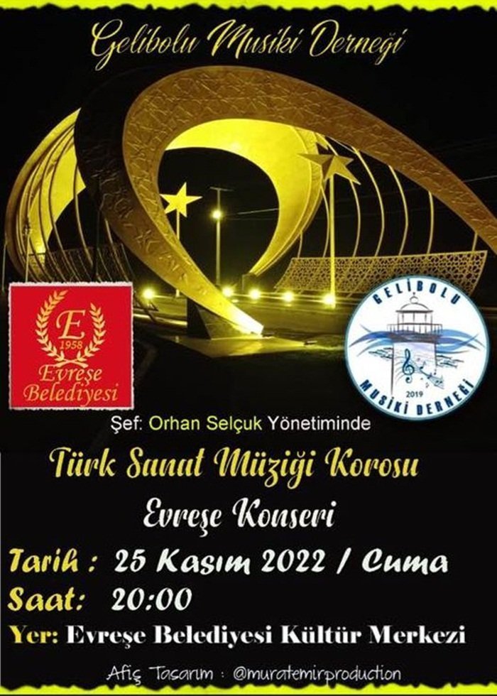 Gelibolu Musiki Derneği Yönetimi, Türk Sanat Müziğini seven tüm vatandaşları  Evreşe konserine davet ediyor.