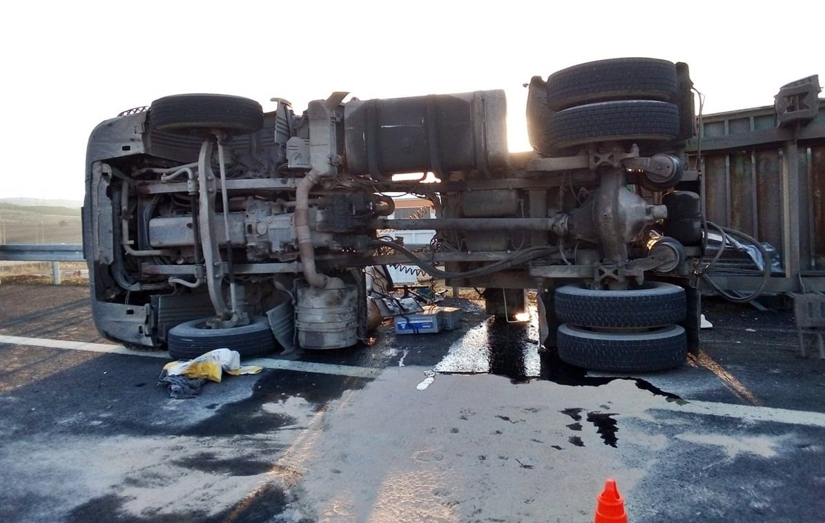 Çanakkale’nin Gelibolu ilçesi Evreşe mevki otobanda meydana gelen tek taraflı trafik kazasında hurda demir yüklü tır devrildi sürücüsü yaralandı.
