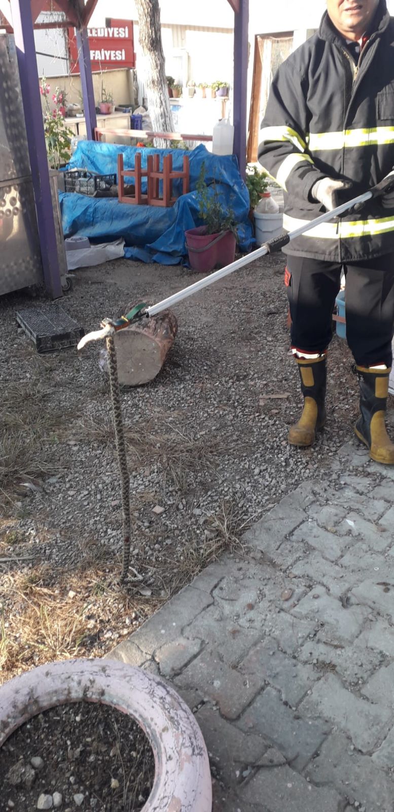 Çanakkale’nin Gelibolu ilçesinde çay bahçesinin sahibinin güvercin ve yumurtalarını yiyen yılanı itfaiyeciler yakaladı.