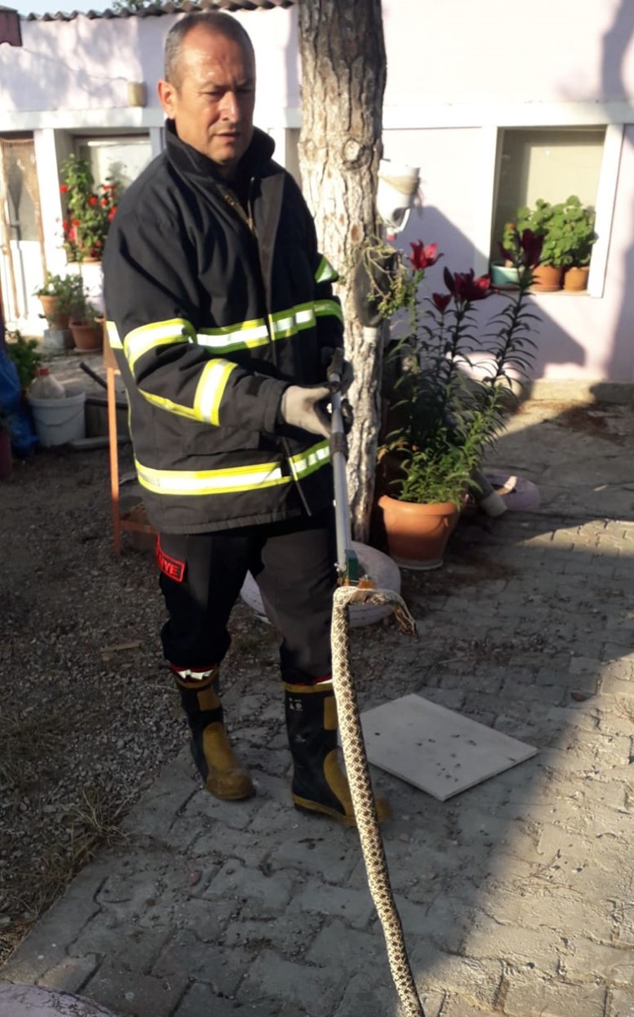 Olay yerine yılan yakalama aparatları ile gelen itfaiyeciler, önce kısa bir araştırmanın ardından Yılanın bulunduğu yeri tespit ettiler. Yarım saatlik bir çalışma sonunda Yılanı boğduğu güvercinlerin olduğu yerde yakaladılar. Yılanın yakalanmasıyla çay bahçesi çalışanları rahat bir nefes alırken, Yılandan uzak bir mevkide doğaya salındı.