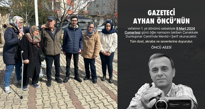 Çanakkale’nin duayen gazetecisi merhum Ayhan Öncü’nün vefatının 1. yıl dönümü nedeniyle Mevlid-i Şerif okutuldu. Çanakkale Dumlupınar Camiinde düzenlenen Mevlid-i Şerif programına Öncü ailesi, dostları, gazeteciler ve çok sayıda vatandaş katıldı. Mevlid-i Şerif okutulan programda, merhum Ayhan Öncü dualarla anıldı.