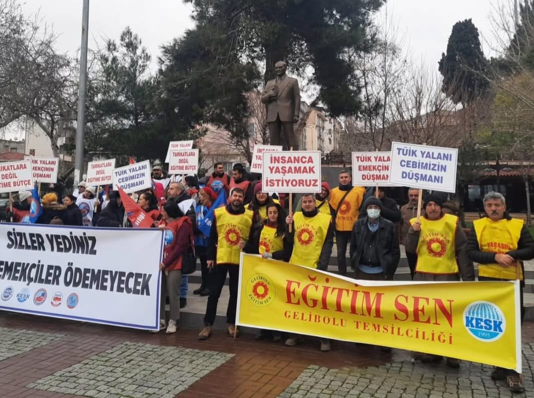 Yapılan 11,54’lük maaş zammını protesto etmek amacıyla Eğitim-İş ve Eğitim-Sen Gelibolu Şubesi, belediye park kahvesi önündeki Atatürk Anıtı önünde basın açıklaması gerçekleştirdi. Eğitim-İş ve Eğitim-Sen Gelibolu Şubesi üyeleri ve STK’ların katıldığı basın açıklamasını Eğitim-İş Sendikası Gelibolu Şube Başkanı Veli Özmen tarafından yapıldı.