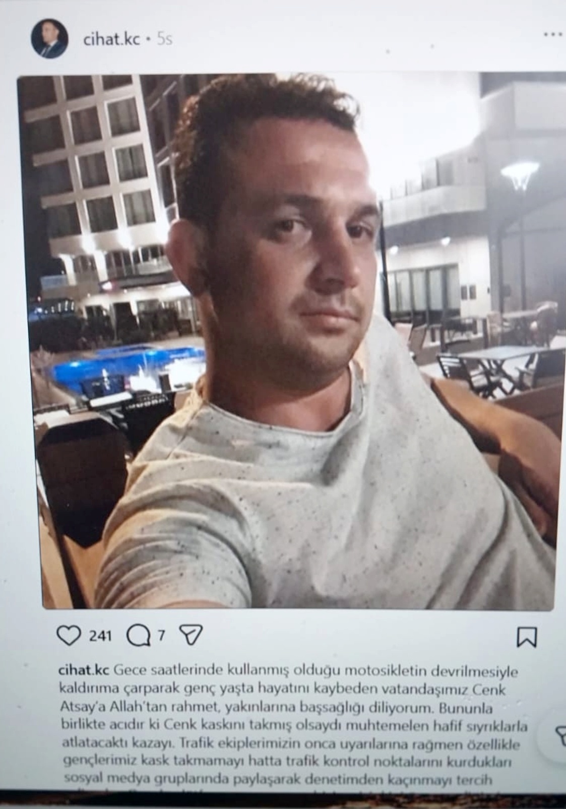 “Gece saatlerinde kullanmış olduğu motosikletin devrilmesiyle kaldırıma çarparak genç yaşta hayatını kaybeden vatandaşımız Cenk Atsay’a Allah’tan rahmet, yakınlarına başsağlığı diliyorum. Bununla birlikte acıdır ki Cenk kaskını takmış olsaydı muhtemelen hafif sıyrıklarla atlatacaktı kazayı.